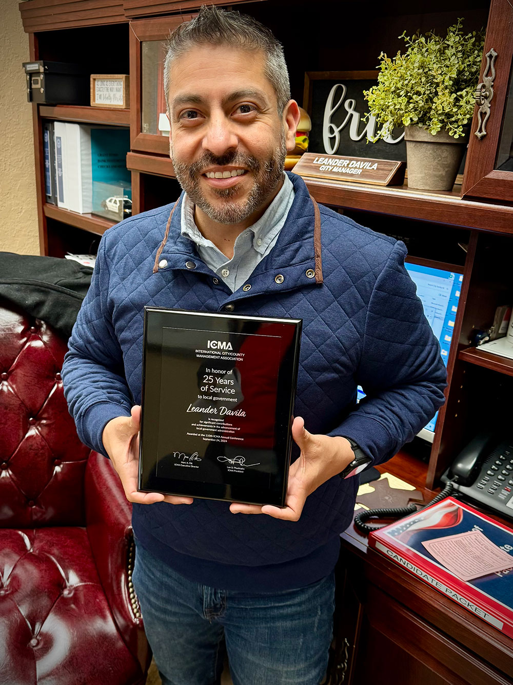 Friona City Manager Lee Davila was recently honored by the International City/County Management Association (ICMA) at their 110th Annual Conference for achieving a remarkable milestone—25 years of dedicated service to local government. This prestigious recognition highlights Davila’s commitment to public service and his contributions to the City of Friona and other communities throughout his career. His leadership and dedication have been instrumental in advancing Friona’s growth and development, making this recognition a proud moment for the entire community.