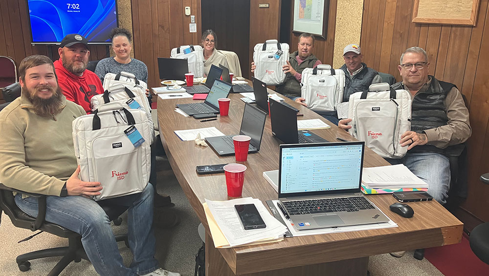 FISD Board of Trustees — (l-r) Sawyer Osborn, Dustin Thompson, Jeri Lynn White, Marla Hart, Wade Schueler, Jason Rector, John Jarecki. January is School Board Recognition Month. As trustees volunteer their time and expertise to guide school districts, they showcase their commitment to creating meaningful educational experiences and opportunities that prepare students for college, careers, and beyond. As a small token of appreciation from Friona ISD, superintendent Daniel Rosales presented each board member with a monogrammed cooler tote.