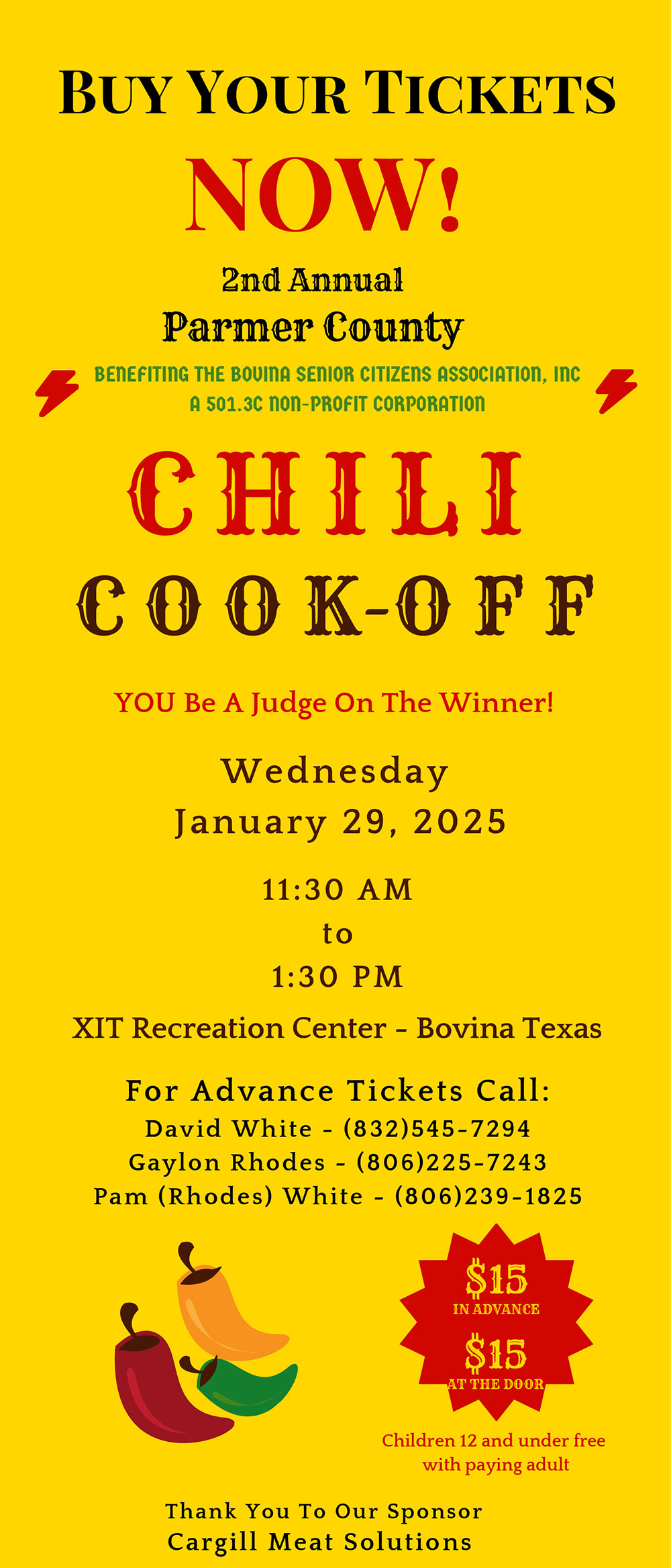 Get Ready — The 2nd Annual Parmer County Chili Cook-Off is scheduled for Wednesday, January 29th at the XIT Recreation Center in Bovina. Cargill Meat Solutions is the event sponsor which benefits the non-profit Bovina Senior Citizens Association. Tickets are now available. Please see ad below.