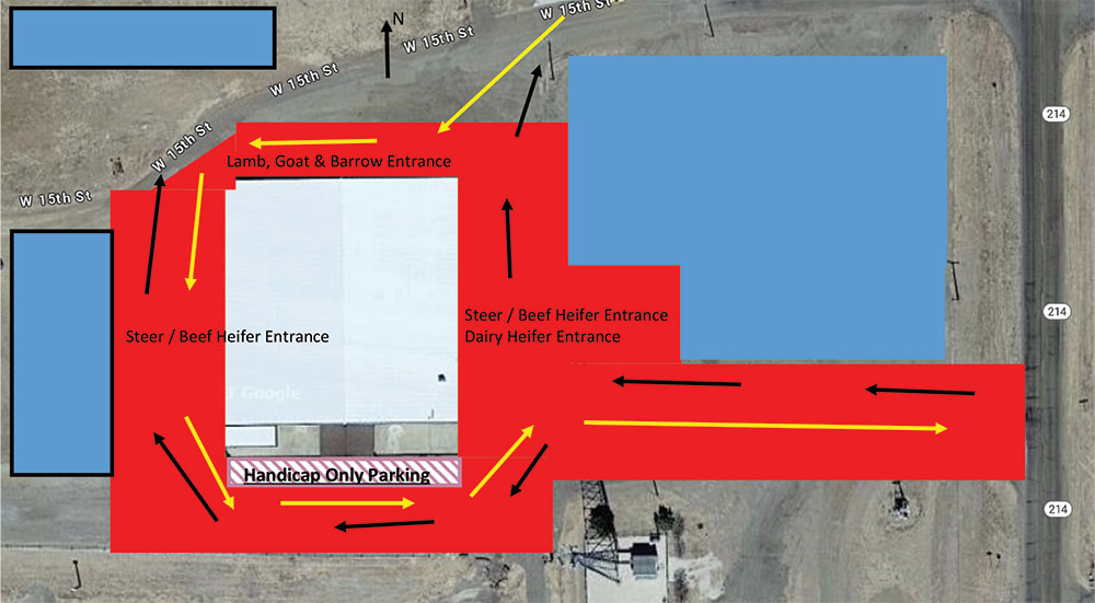Lambs, goats and barrows will unload on the north side of the barn, following the yellow arrows to enter from 15th Street and exiting using Highway 214. Penning will be in the center barn. Lambs and goats will be allowed into the barn one hour after the completion of the steer / heifer show on Tuesday, tack and grooming allowed in the west barn only, no animal containment. Barrows will be allowed entrance one hour after the lamb and goat show on Wednesday.