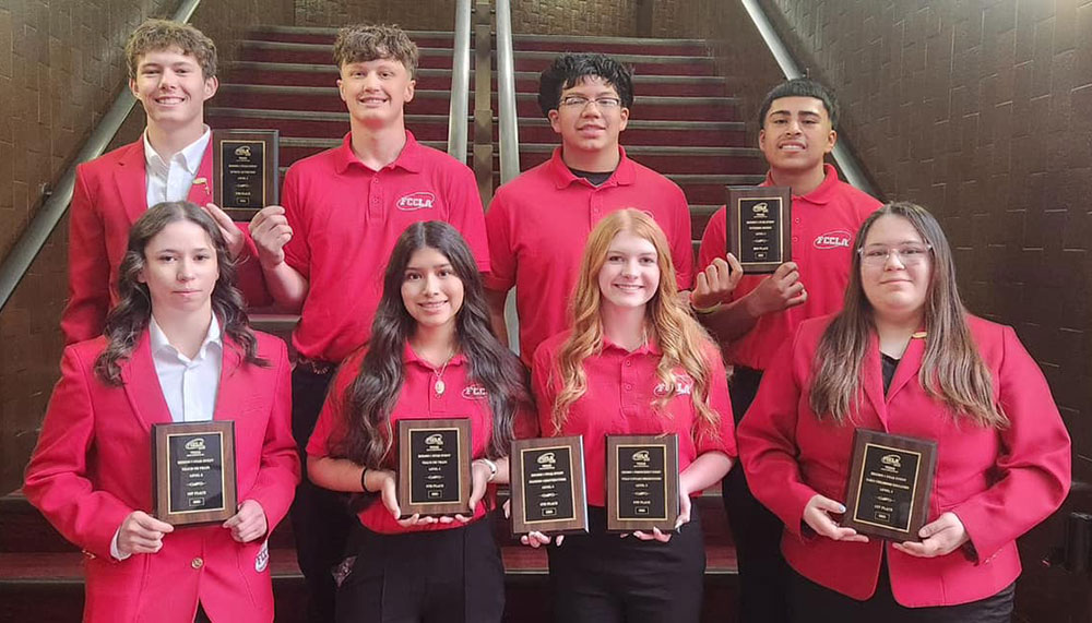 FCCLA State Qualifiers — Front Row (l-r) Lexi Saldana - Teach & Train; Emily Ibarra - Teach & Train; Stevie Herring - Cupcakes; Nadia Snyder - Early Childhood Education; Back Row (l-r) Brice Jeter & Thomas Cook - Sports & Nutrition; Denzel Perez & Hector Aguirre - Interior Design. Not in photo was Sophia Leon - Fashion Construction. They will compete at state April 11th-13th. Congratulations and good luck!