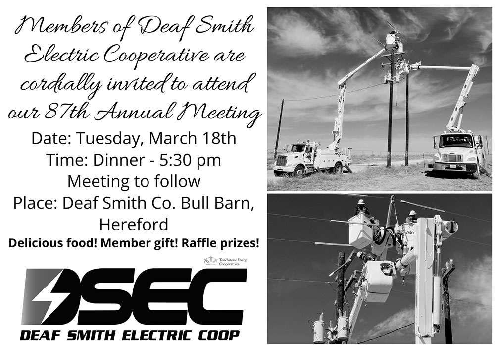 Light It Up — Deaf Smith Electric Cooperative (DSEC) will hold its 87th Annual Membership Meeting next Tuesday at the Deaf Smith County Bull Barn in Hereford.