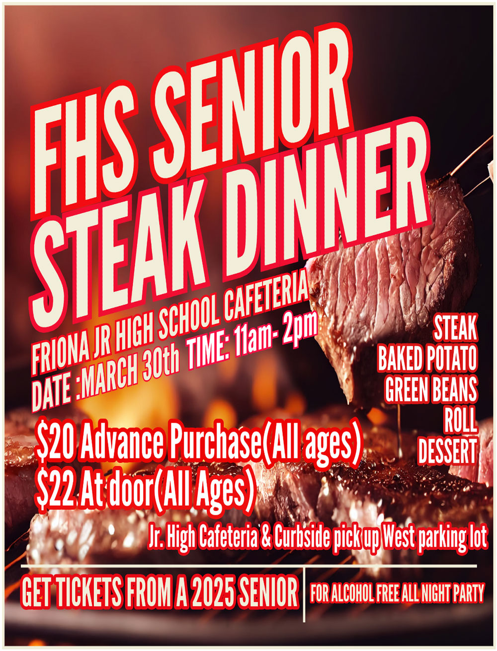 Don’t Miss Out! — FHS Senior Steak Dinner tickets are available from any FHS 2025 Senior. The meal, which includes a steak, baked potato, green beans, roll, dessert, will be served on Sunday, March 30th from 11 a.m. until 2 p.m. You can dine-in at the Jr. High Cafeteria or do curbside pick-up in the West parking lot. Tickets prices (all ages) are $20 in advance and $22 at the door. Proceeds will benefit the Alcohol Free All Night Graduation Party in May.