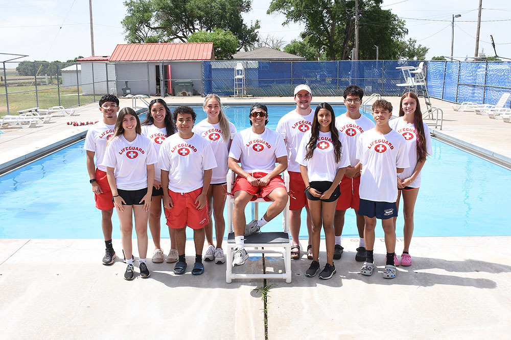 2025 City of Friona Swimming Pool Staff — Back Row: Abasai Torres, Stephanie Cruz, Kitzy Welch, William Husted, Eden Mills, Reese Steelman; Front Row: Amberly Madrid, Pool Assistant Manager JJ Trevino, Pool Manager Malachi Torres, Pool Cashiers Leslie Ortiz and Kayden Rejino