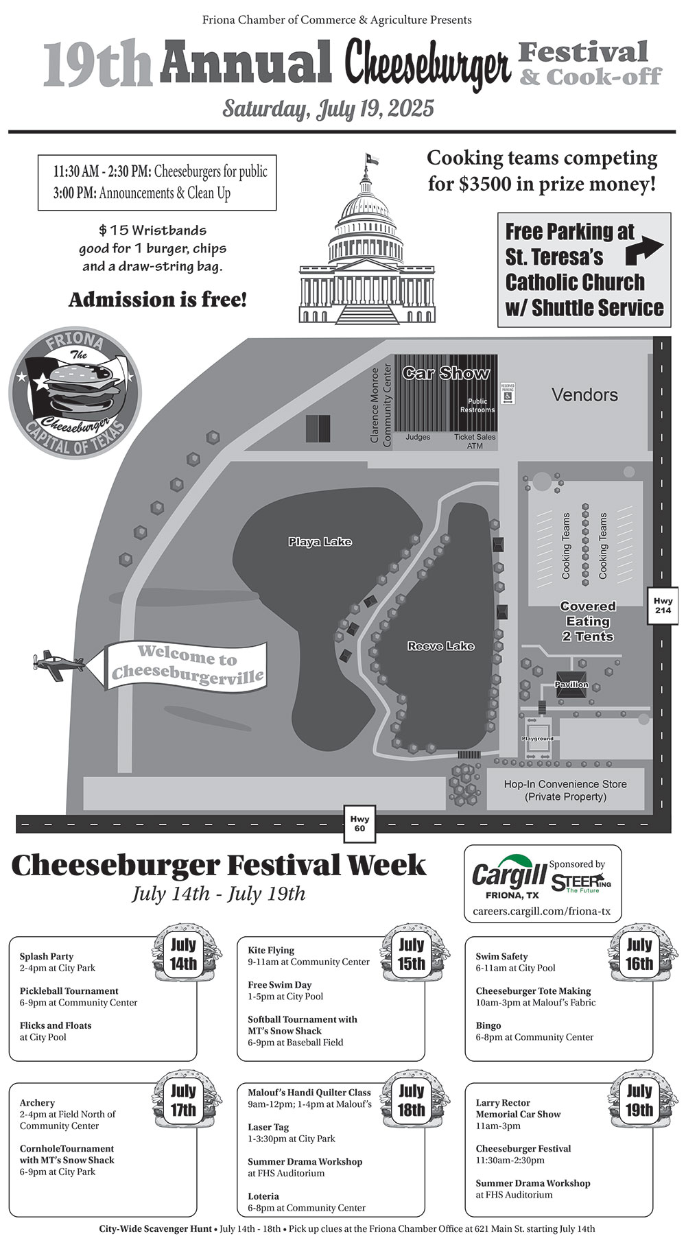 Let the Hunt Begin — A City-Wide Scavenger Hunt will kick off Cheeseburger Festival Week and runs from July 12-18. Pick up clues at the Chamber office at 621 Main on Monday. Call 806-250-3491 for more information.