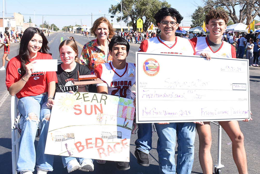 The Sophomore Class Team won the Maize Days Bed Race and received a Bed Race trophy and a $500 check for their class. Team members were (l-r) Bella Flores, Harley London, David Tafoya, Denzel Perez, and JD Villegas. Sandra Berend is a class sponsor.