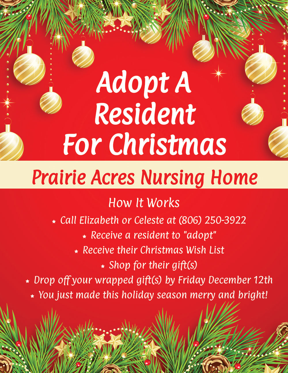 Prairie Acres News — Loretta Hand is the Prairie Acres Resident of the Month for December. The Employee of the Month for December is Bianca Oliva. She works in the Dietary Department and has been with Prairie Acres since May 2025. The annual Prairie Acres Christmas Party is set for Tuesday, December 16th at 6:30 p.m. Everyone is invited.